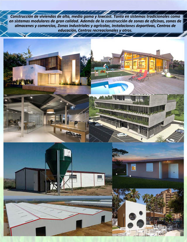 6. Construcción de viviendas de alta, media gama y lowcost. Tanto en sistemas tradicionales como en sistemas modulares de gran calidad. Además de la construcción de zonas de oficinas, zonas de almacenes y comercios, Zonas industriales y agrícolas, instalaciones deportivas, Centros de educación, Centros recreacionales y otros.